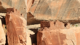 Nous prenons la Butler Wash Road vers le nord. Après quelques kilomètres (1 ou 2, tout au plus), nous repérons les ruines, appelées Pedestal Ruins ou Pedestal Rock Ruins. Elles sont vraiment faciles à localiser. Dire que nous sommes passés par là plusieurs fois mais sans jamais regarder du bon côté …