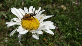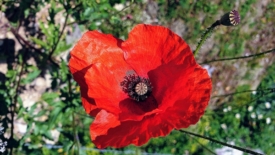 De l’autre côté de la route, des taches rouges attirent notre regard : ce sont des coquelicots. Ils poussent au pied de piquets de clôture, eux-mêmes plantés dans des gravas. Des graines devaient y traîner. Malgré de multiples tentatives, le vent nous empêchera de faire une belle prise de vue bien nette. Nothing we can do about it!