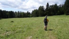 S’ensuit une marche rectiligne de près de 2km dans une mini combe. Nous passons d’un pâturage qui semble être passé dans les mains d’un paysagiste à un champ en friche.