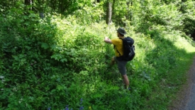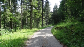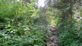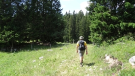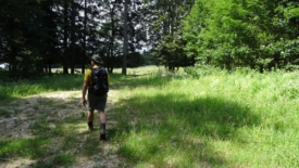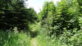 D’une route, nous passons à une piste forestière à deux ornières, puis à un petit sentier bordé d’herbes hautes.