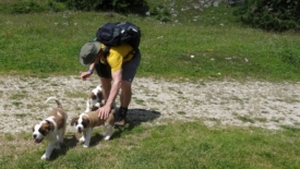 Il y règne une animation inhabituelle. Bien sûr, quelques randonneurs sont attablés mais ce qui fait la différence est une meute de chiens, de chiots pour être plus précise : il y a en 101… Mais non, 10, 10 petits Saint-Bernard de 9 semaines, d’une seule et même portée. 6 femelles, 4 mâles. A la naissance ils pesaient entre 500 et 800 g et 9 semaine plus tard le plus lourd pèse 12 kg. La mère fait entre 60 et 65 kilos. Je vous laisse imaginer la consommation de nourriture.