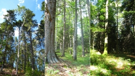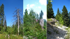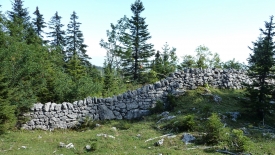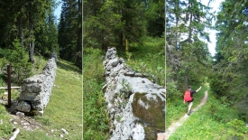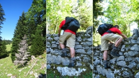 Nous continuons vers le nord, dans la forêt. Les murs sont très présents, certains entretenus (1) d’autres clairement laissés à l’abandon (2). Le sentier sur lequel nous marchons n’est pas très fréquenté et Stefano doit le libérer des toiles d’araignées qui l’habitent (3).