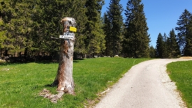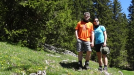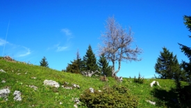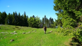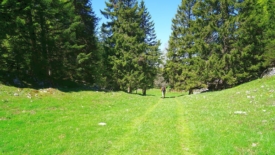 La végétation, peu dense, nous permet de profiter du soleil. Nous arrivons à une croisée de chemin : à droite, La Blondine, à gauche, un pâturage et un chalet – La Coche – que nous gardons pour une autre balade.