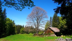 Nous rejoignons les traces d’une de nos précédentes balades (voir le billet Vers le Haut du Mollendruz) et arrivons à un petit refuge forestier, Le Pralet. Même s’il est encore un peu tôt et si la lumière n’est pas géniale, ce petit refuge est réellement magnifique.