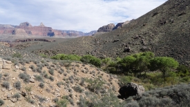 Nous nous engageons sur le sentier qui mène à Plateau Point. À droite, le Bright Angel Creek et son ruban de verdure.