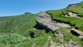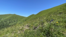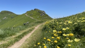 Nous repartons donc vers le plomb du Cantal, restant sous le sommet, non sans jeter un coup d’œil sur nos arrières, histoire de s’assurer qu’aucune bête malfaisante ne nous suit. On ne sait jamais, le diable aurait pu y laisser un de ses acolytes maléfiques. Ouf, rien ! Si ce n’est des anémones soufrées et des trolles d’Europe à perte de vue.