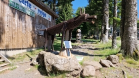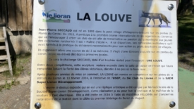 A Super Lioran, le sentier se fond dans un parcours de mini-golf qui a vu des jours meilleurs. Devant la porte du ski club trône une sculpture réalisée à l’aide de câbles et représentant une louve.