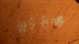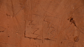 Dessinés sur ce mur, dans l’enduit encore frais, je remarque des lignes fines. Vaughn Hadenfeldt ne les avait jamais repérées et les interprète comme des motifs de sandales.