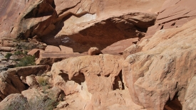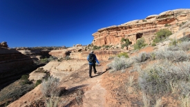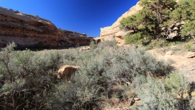 Deux randonneurs arrivent alors que nous sommes en train d’étudier le site. Lui, la 60aine, peut-être plus, cheveux longs et barbe poivre et sel. En sandales et sans chaussettes. Elle beaucoup plus jeune. En discutant, nous apprendrons que lui est guide et elle, donc, sa cliente. Son nom : Vaughn Hadenfeldt. Sa boîte : Far Out Expeditions, qui a fermé entre-temps, car Vaughn a pris sa retraite. Il a participé à l’écriture de plusieurs livres et connaît vraiment, mais vraiment bien la région et toutes les trésors qu’elle recèle. Il est par ailleurs l’un des directeurs de l’ONG Bears Ears Partnership (anciennement Friends of Cedar Mesa), qui s’efforce de protéger et de faire respecter les paysages culturels et naturels de la grande région de Bears Ears.