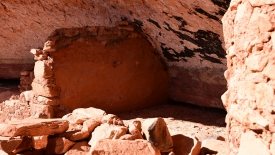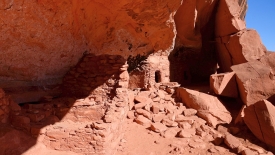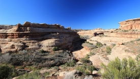 Dernier regard sur Polly’s Island (les ruines sont sur le dernier ledge), le Grand Gulch et au fond à droite, l’entrée de Polly’s Canyon.