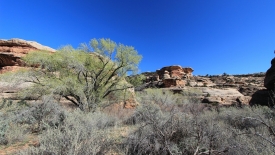 Nous n’aurons sans doute pas le temps de nous arrêter mais ces rochers arrondis que l’on voit, à droite du cottonwood tree, abritent des pétroglyphes. Nous le savons car, lors de notre descente en 2011, des randonneurs rencontrés sur le sentier nous en avaient parlé. Nous avions gardé la visite pour le retour et évidemment, faute au temps qui file si vite en vacances, nous avions dû y renoncer.