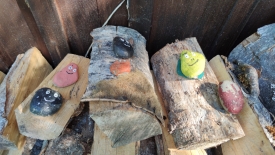 Des petits cailloux peints, déposés sur le tas de bois, devant le refuge.