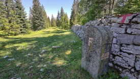 Deuxième jour de notre week-end au Brassus. Cette fois, nous montons directement à la frontière que nous longeons sur plusieurs kilomètres. Nous y trouvons des bornes, certaines très anciennes décorées de fleurs de lys, d’autres plus récentes, de simples blocs de béton. L’arrivée sur la Grand Tèpe nous offre une magnifique vue sur la vallée.