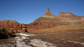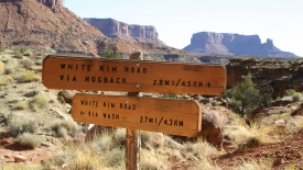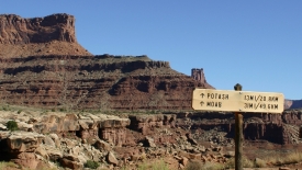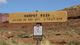 Bonne idée après coup, car le sentier passe par le lit d’une rivière asséchée, avec un sol assez sablonneux et chiant au possible pour marcher. Ce sont tout de même 2.7 miles à parcourir avant de rejoindre la route White Rim.