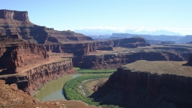 Le Colorado. On distingue très bien, au bord du rim, la route que nous avons empruntée… A l’horizon, la chaîne de montagne La Sal Mountains.