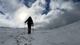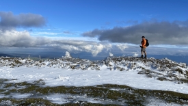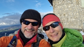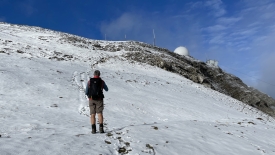 La température est agréable, jusqu’à ce qu’un gros nuage noir envahisse le sommet. Nous écourtons la pause et nous remettons en route.