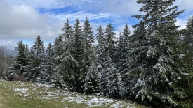 Le dernier tronçon de la balade se fait par Guinfard, avant de rejoindre la piste forestière empruntée ce matin. Nous sommes enchantés de notre journée, de cette première neige de l’hiver 2022-2023 et surtout des petits moments de soleil et de ciel bleu.