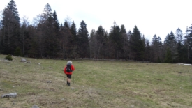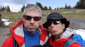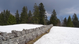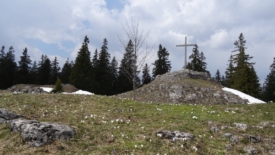 Le Crêt de la Neuve est occupé. Deux taches qui nous disent bonjour du bout des lèvres. OK, nous avons compris : nous sommes indésirables. Une photo de croix plus loin et nous partons, regardant attentivement où nous posons les pieds, histoire de ne pas massacrer de fiu-fiu.
