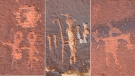 Oui, ces deux silhouettes qui se tiennent la main, sous la lune ou le soleil (1) ; un autre personnage marchant avec une cane (crook cane) qui serait un symbole de fertilité ou d’appel de la pluie (2) ; enfin une figure debout, arborant des cornes ou une coiffe (3).