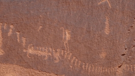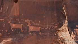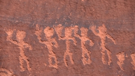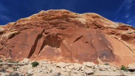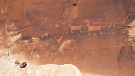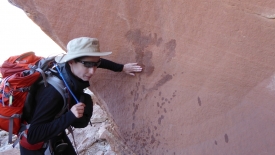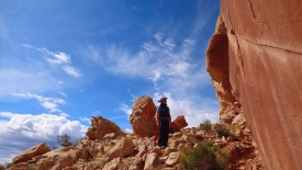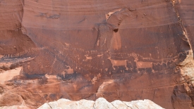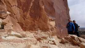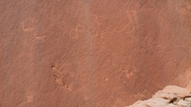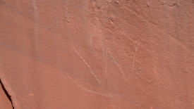 Nous montons vers le rim. Non loin du Procession Panel, il y a une paroi décorée de pétroglyphes très anciens et presque effacés par le temps. À quelques centimètres, un smiley a été dessiné. Nous n’y croyons pas. Imbécile, idiot, abruti, enfoiré, … tous les adjectifs y passent. Du bout des doigts, avec de l’eau, je tente de l’effacer. J’y parviens, plus ou moins. en y laissant la peau superficielle de tous mes doigts.