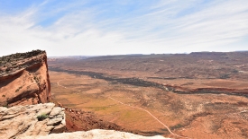 Le côté Sud. Ce serpent de verdure matérialise le Comb Wash. Au fond, au centre, on peut deviner les buttes de Monument Valley. Bon, c’est surtout parce que nous savons qu’elles sont là !