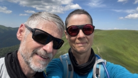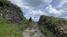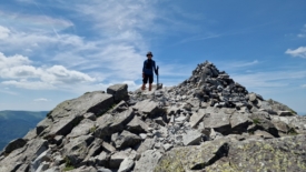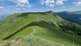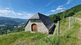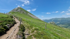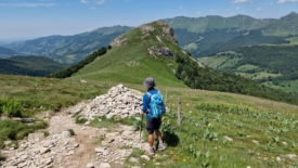 Un traileur arrive en sens inverse. Damn it! Cette silhouette est familière… Nous n’en croyons pas nos yeux. C’est lui, c’est le traileur rencontré il y a deux jours, en contre-bas de l’Aiguillon, puis hier brièvement, au-dessus de Font d’Alagnon. Wow, quel hasard ! Lui – c’est Maxime – est tout aussi surpris que nous. Cette fois nous prenons le temps de discuter. Nous nous étonnons de la longueur de ses courses et des dénivelés. Il répond du tac au tac que nous ne sommes pas en reste avec nos 20-25 km quotidiens. Il s’entraîne pour une course dans les Pyrénées, début juillet, si mes souvenirs sont bons. Nous nous disons aurevoir. Demain, nous quittons la région et il n’y a donc aucune chance que nous nous croisions à nouveau.