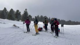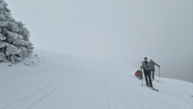 Le brouillard obscurcit le soleil. Les pierres affleurantes témoignent du manque de neige. Mais Eric nous promet de meilleures conditions, dès que nous aurons pris de l’altitude.