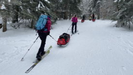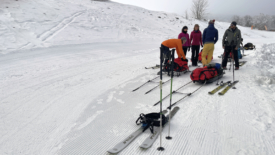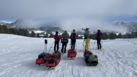 Quatre pulkas pour six personnes. Eric tirera la plus lourde, celle avec le bois et le teepee. Stefano, Simon et Laurence se portent volontaires pour les trois autres. Nous équipons tous les skis de peaux, indispensables à la traction des pulkas.