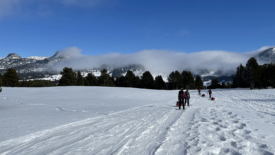 Et nous voilà partis ! Les premières centaines de mètres calment les ardeurs, surtout de celles et ceux halant les pulkas. La pente est vive et le poids mort à tracter requiert force et énergie. Après un passage un peu plus rude que les autres, Eric nous encourage, Magali et moi, à pousser les pulkas avec un bâton, en coinçant la pointe dans un endroit prévu à cet effet.