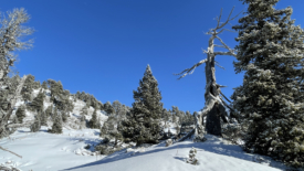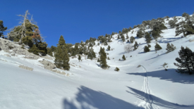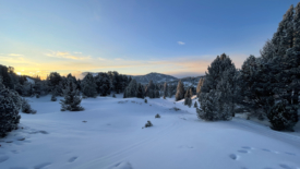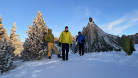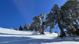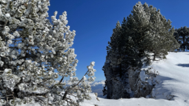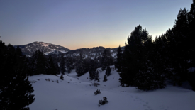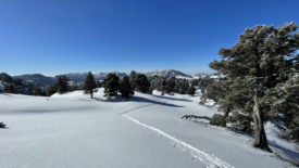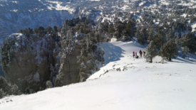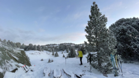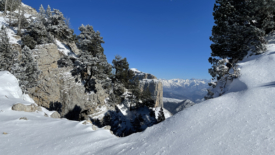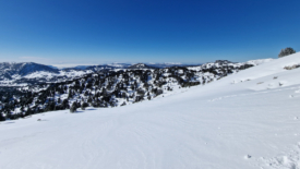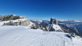 Pour notre seconde journée dans le Vercors, la première passée intégralement sur les hauts plateaux, nous partons vers les rochers du Parquet admirer le Mont Aiguille du bord des falaises. Les 5 à 8 centimètres de neige tombés durant la nuit ont embelli le paysage et nettement amélioré les conditions de glisse.