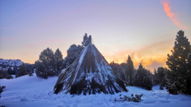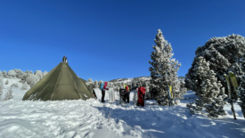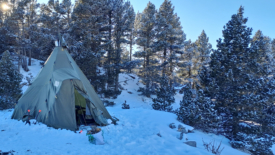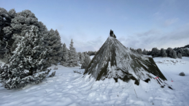 Notre campement est quelque part, au milieu des pins. Simon, oeil vissé contre un monoculaire, passe un long moment à observer. Puis il s’écrie : je l’ai repéré ! Il me passe le monoculaire et me décrit le chemin à parcourir visuellement pour le trouver. Il faut suivre la crête de gauche jusqu’à l’intersection avec la montagne plate en second plan. Puis, descendre tout droit, suivre une ligne oblique de pins de la droite vers la gauche et descendre encore verticalement. Et… la lavvu est effectivement là, brillant légèrement sous le soleil.