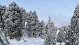 Tombée cette nuit, une petite couche de neige est venue poudrer le relief et les pins. La lavvu a rétréci, sa base avalée par la neige.