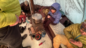 A l’intérieur de la tente, le poêle vomit d’épaisses volutes de fumée. Eric est désespéré. Nous aussi d’ailleurs. Alors que des petits biscuits salés circulent avec le vin blanc, de l’eau chauffe pour la cuisson des pâtes. Quatre berlingots de sauce tomate et le reste du fromage à fondue viendront compléter le festin. Eric cherche frénétiquement la boîte contenant le sel qui réapparaîtra au moment de servir. Stefano goûte les pâtes et nous garantit qu’elles seront al dente. Les assiettes se tendent, se rapprochant de la casserole fumante. Les yeux brillent et les papilles se préparent à la fête. Le sachet de fromage râpé circule. L’heure n’est ni à la diète ni au régime. Il faut compenser la perte calorique du jour, entre effort physique et froid. Sans parler de la nuit glaciale qui s’annonce. La casserole se vide rapidement. Nonnettes, pommes et compotes de pomme viennent terminer le repas.