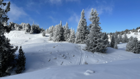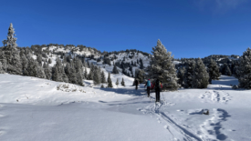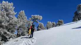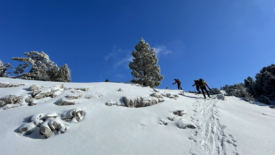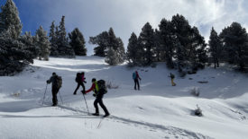 Pour ceux qui n’ont pas gardé les peaux sous les skis, les montées un peu raides se franchissent en marche en canard.