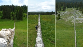 Nous, nous aimons bien les murs(1) (2). En voici un, très beau, en bas la route qui mène au Marchairuz depuis la Bassine (3).