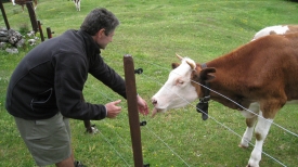 Et pendant que la pluie tombe, j’essaye de charmer une vache en lui offrant une fleur …