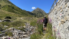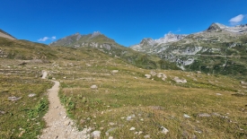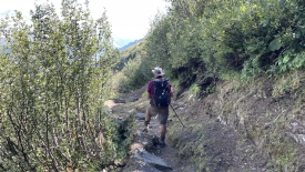 Le flan de la montagne se fait plus pentu et le sentier s’accroche dans la pente. Nous étions par là-bas, hier, dans les pierriers. Nous avons encore les yeux brillants du merveilleux paysage que nous y avons admiré.