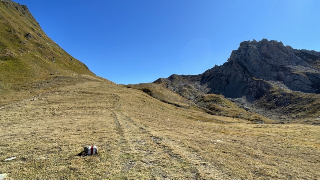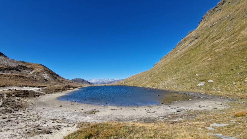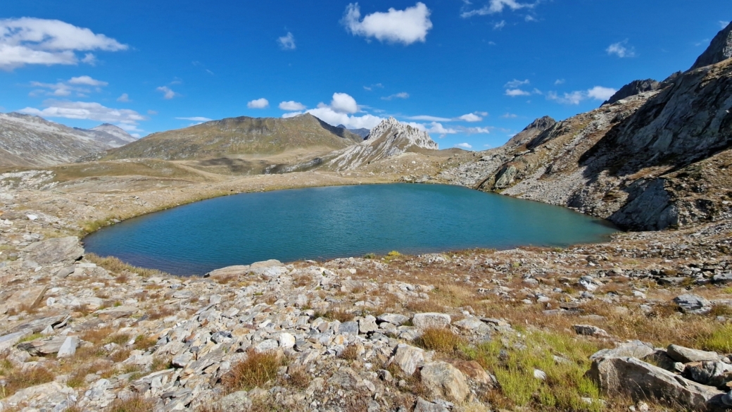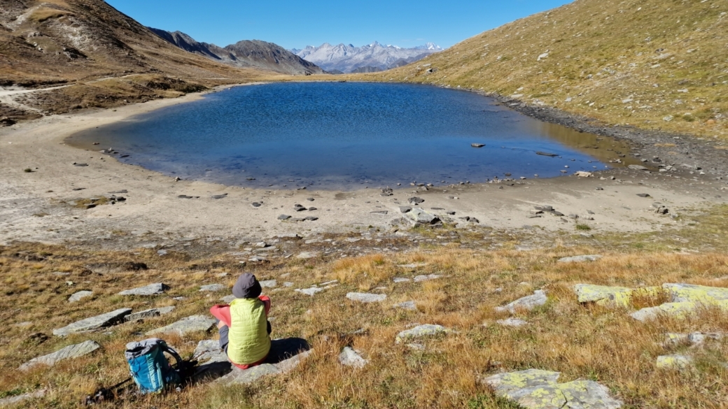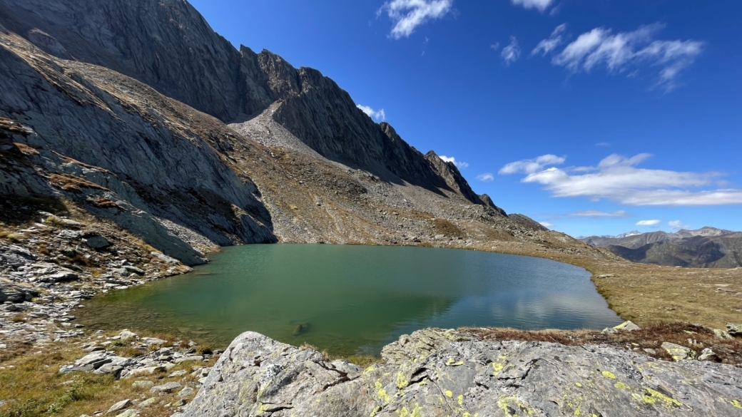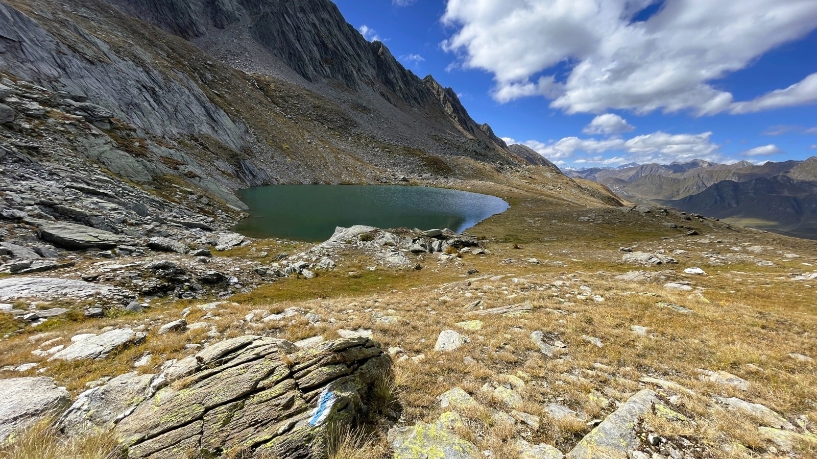 Au revoir joli petit lac. Sur la photo ci-dessous, l’on remarque la marque de peinture « blanc – bleu – blanc » sur le rocher en premier plan. Nous pensons qu’il s’agit d’un nouveau sentier de randonnée alpine, qui doit mener au col de Bassa di Pos Léi. En tout cas, il n’est pas encore tracé sur le géoportail suisse mais ça ne nous empêche pas de le suivre pendant quelques centaines de mètres.