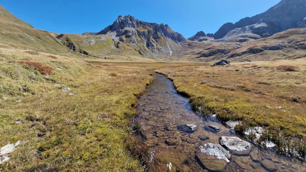 Nous ignorons d’où provient l’eau du lac, mais en tout cas, c’est d’ici qu’elle sort. L’eau est par ailleurs captée, peut-être pour alimenter les étables de l’Alpe Carorescio qui se trouve en contre-bas.