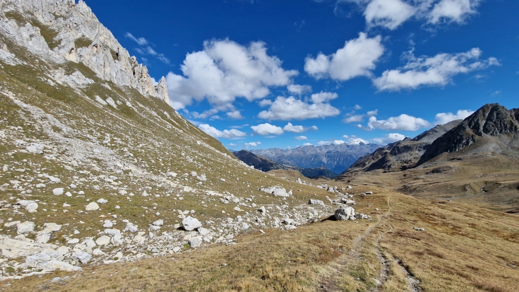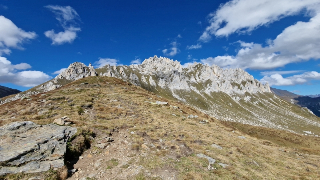 Devant nous, une belle vue sur les aiguilles du Campanítt / Piz di Colómb.