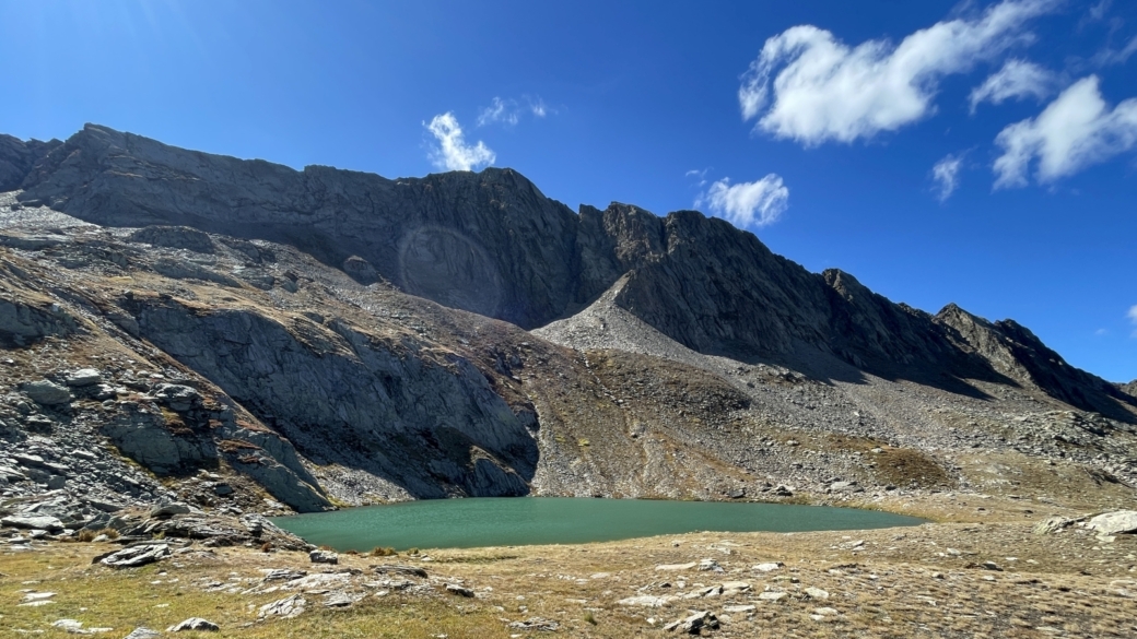 Et voici notre petit lac, le Lèi Pécian, qui tire son nom de la montagne qui le surplombe, le Pécianett (« petit peigne »), juste devant le Pécian (« peigne » en lombard).