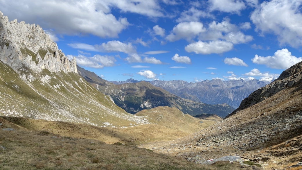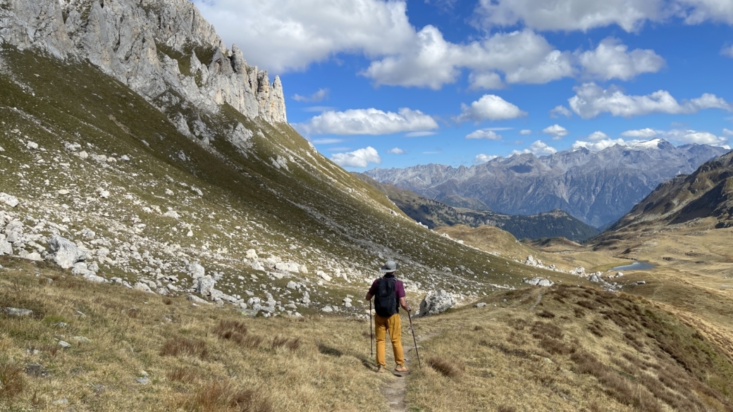 Marie-Catherine se retourne et me fait remarquer qu’hier, nous étions juste en face, là-bas au Passo di Gana Negra, sous les montagnes aux roches noirâtres.