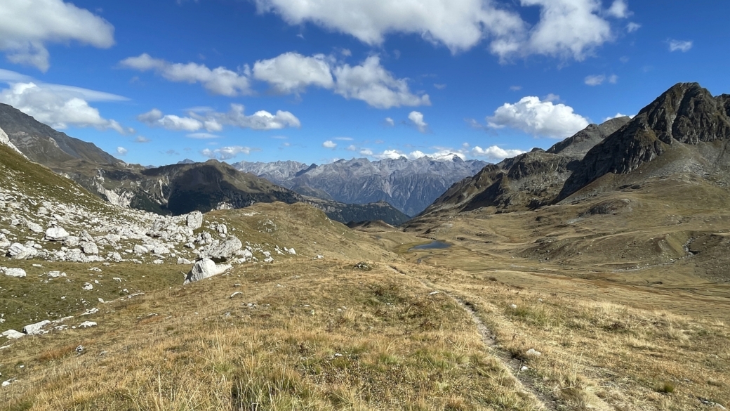Nous approchons gentiment de la jonction avec le sentier de randonnée. Au loin, nous pouvons voir le Lago di Cane (lac de chien).