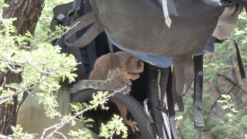 Des écureuils rôdent et un s’affaire à ronger un tuyau de CamelBak. Ce n’est donc pas une légende… Planquez votre bouffe, les amis. Les écureuils sont là !