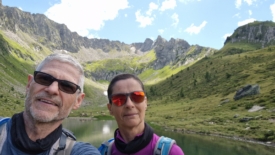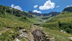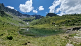Un dernier mamelon et le refuge est là. Nous voyons deux enfants y rentrer. Pour leur laisser un peu de temps, Stefano me propose de pousser jusqu’au lago della Valletta, un peu plus loin, au pied des montagnes.
