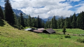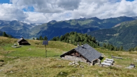 En contrebas, la longue étable en angle de l’alpe di Prato est entourée de terre piétinée par les bêtes, mêlée à du rumex écrasé. Nous avons rarement vu un tel degré de négligence. Le sentier a également souffert du passage du troupeau.