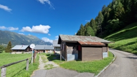 A l’entrée du village de Giof, un grand parking avec seulement quelques places vides. La plupart des maisons sont ouvertes, tables et bancs de bois ou de pierre attendant les convives, parasols déployés et surtout drapeaux suisses pendant aux fenêtres ou accrochés à des poteaux. Le 1er août, fête nationale suisse, n’est que dans quelques jours !