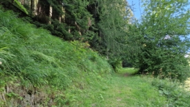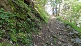 Le sentier est large et agréable, consolidé quand nécessaire par des murs de pierre, bordé de framboisiers dont certaines, quoique minuscules, sont arrivées à maturation.
