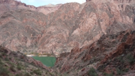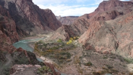 Arrêtons-nous un peu sur la photo ci-dessous. Sur la gauche, le sentier qui part de Indian Garden et qui mène à Plateau Point se distingue. Un petit bout également du Bright Angel trail, au lieu dit the Saddle, là où le Bright Angel Creek se jette dans une gorge alors que le sentier lui reste sur le flanc de la montagne. C’est à partir de là que commence la zone dite du Devil’s Corkscrew. Une série de switchbacks qui amène les randonneurs au niveau du Colorado, bien que ce dernier soit encore loin. Dans le coin inférieur droit, notre destination : the Colorado river.
