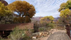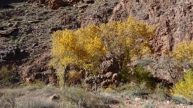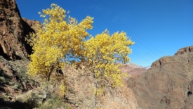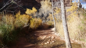 Bientôt, devant nous, les switchbacks du Devil’s Corkscrew. Nous les attaquons d’un pas ferme et régulier et bientôt nous arrivons près du saddle, là où une partie de sentier est inondée. En témoignent ces cottonwood trees aux feuilles dorées.